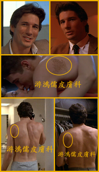 李查吉爾的貝克氏母斑在他的左臂背部.此種斑常見於背部、手臂、胸部、這種咖啡色片狀的母斑有時中間的毛還會特別的濃密,稱為「貝克氏母斑」。去除的方法是以鉺-雅各雷射磨皮為主,但效果中等,術後還是隱約可見痕跡,但至少可達到修飾的目的。李察基爾是1980年代初期的性感偶像,在螢幕上極具有魅力.可惜曾在1980年代中期與末期消失過一段時間.一直到在1990年與茱莉亞蘿勃茲合作電影麻雀變鳳凰才鹹魚翻身東山再起.是辛蒂克勞馥的前夫.